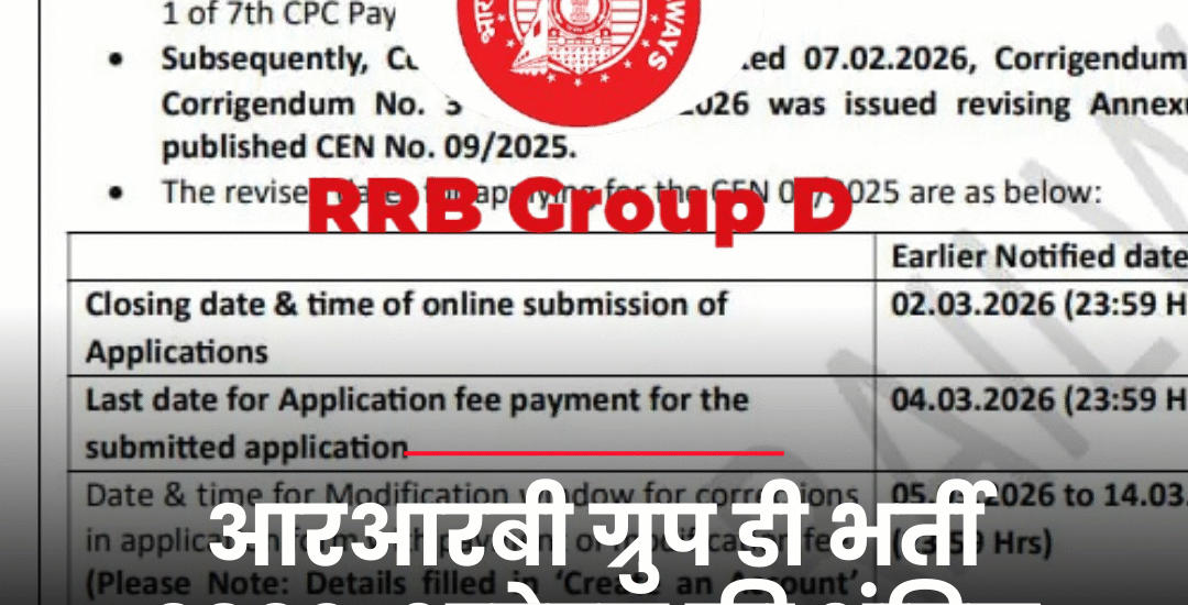 भारतीय रेलवे में नौकरी की तैयारी कर रहे युवाओं के लिए महत्वपूर्ण खबर है। CEN नंबर 09/2025 के तहत जारी आरआरबी ग्रुप डी भर्ती 2026 के लिए ऑनलाइन आवेदन की अंतिम तिथि बढ़ा दी गई है। इससे उन हजारों अभ्यर्थियों को राहत मिली है जो तय समय सीमा के भीतर आवेदन नहीं कर पाए थे।