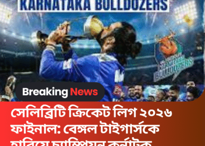 ক্রিকেট ও বিনোদনের মেলবন্ধনে গড়ে ওঠা সেলিব্রিটি ক্রিকেট লিগ (CCL) ২০২৬-এর ফাইনালে জমজমাট লড়াইয়ের পর চ্যাম্পিয়নের মুকুট জিতল কর্নাটক বুলডোজার্স। রবিবার কোয়েম্বাটোরে অনুষ্ঠিত ফাইনাল ম্যাচে তারা বেঙ্গল টাইগার্সকে ৬ উইকেটে পরাজিত করে ট্রফি ঘরে তোলে। এই জয়ের মাধ্যমে CCL-এ নিজেদের শক্তিশালী উপস্থিতি আরও একবার প্রমাণ করল কর্নাটক দল।